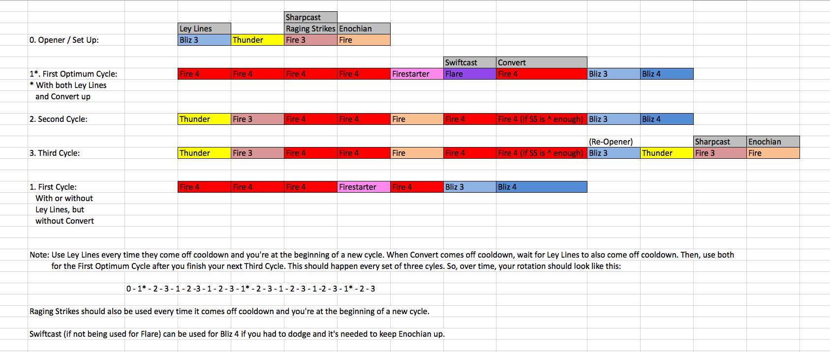 With all that out of the way, here is a bare-bones, basic-yet-effective BLM rotation that me and a friend created back at the beginning of Heavensward. I believe your Spell Speed (SS) had to be around 680 to be able to use four Fire IV's and still have time to cast Blizzard IV before Enochian falls off in the second and third cycle. I do remember they adjusted stats here and there so you may have to experiment to see if your spell speed is high enough. As long as you have some i200 gear though, I think you should be fine.